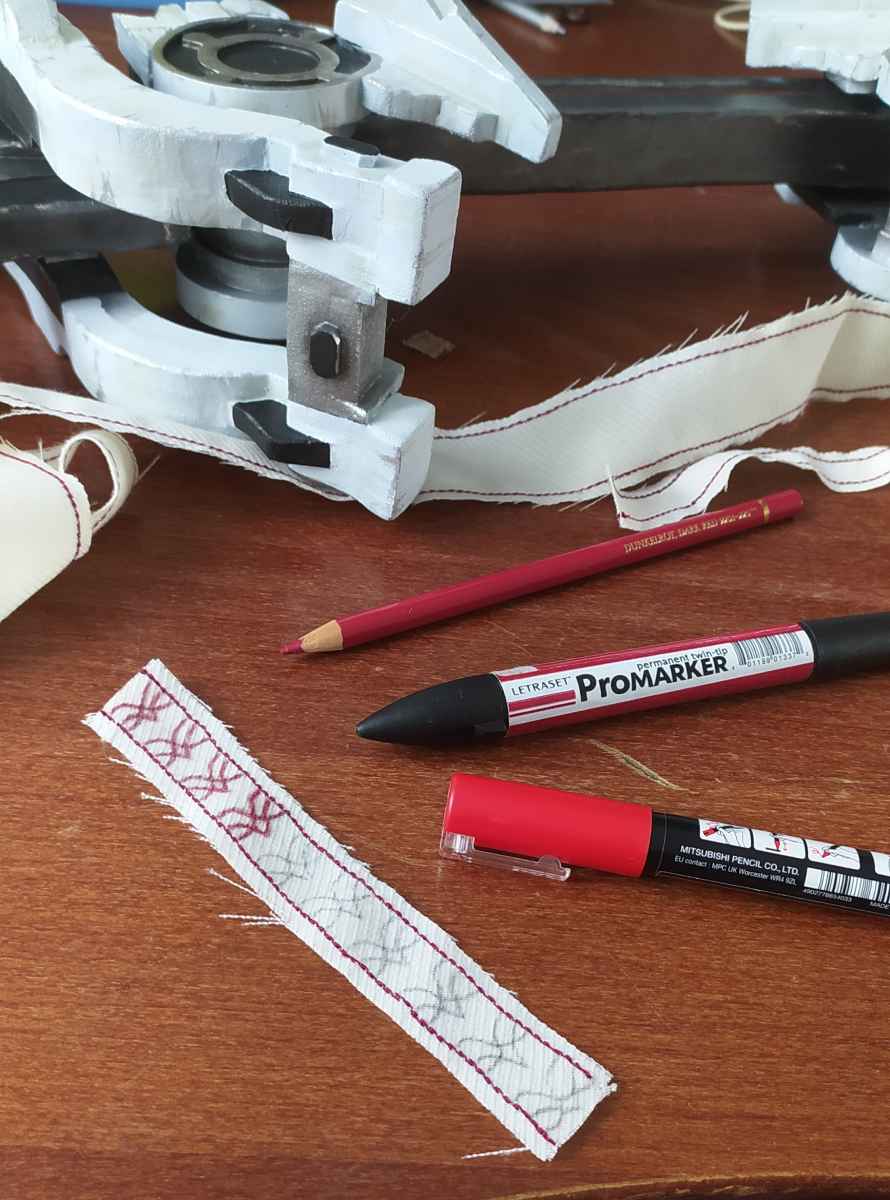 Je découpe des bandes d’un tissu blanc un peu rugueux, que je viens décorer de beaux motifs rouges.