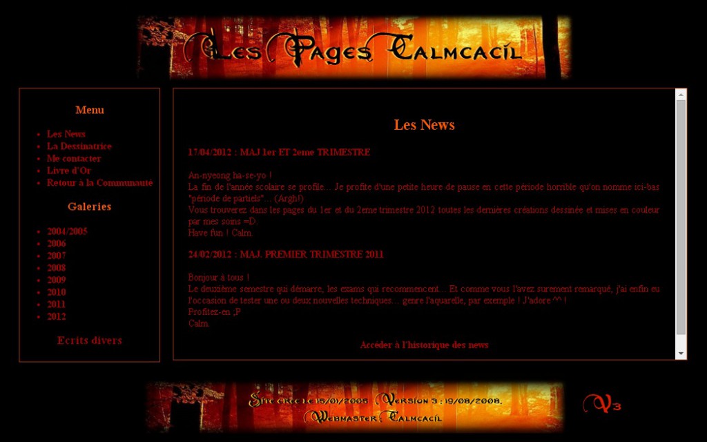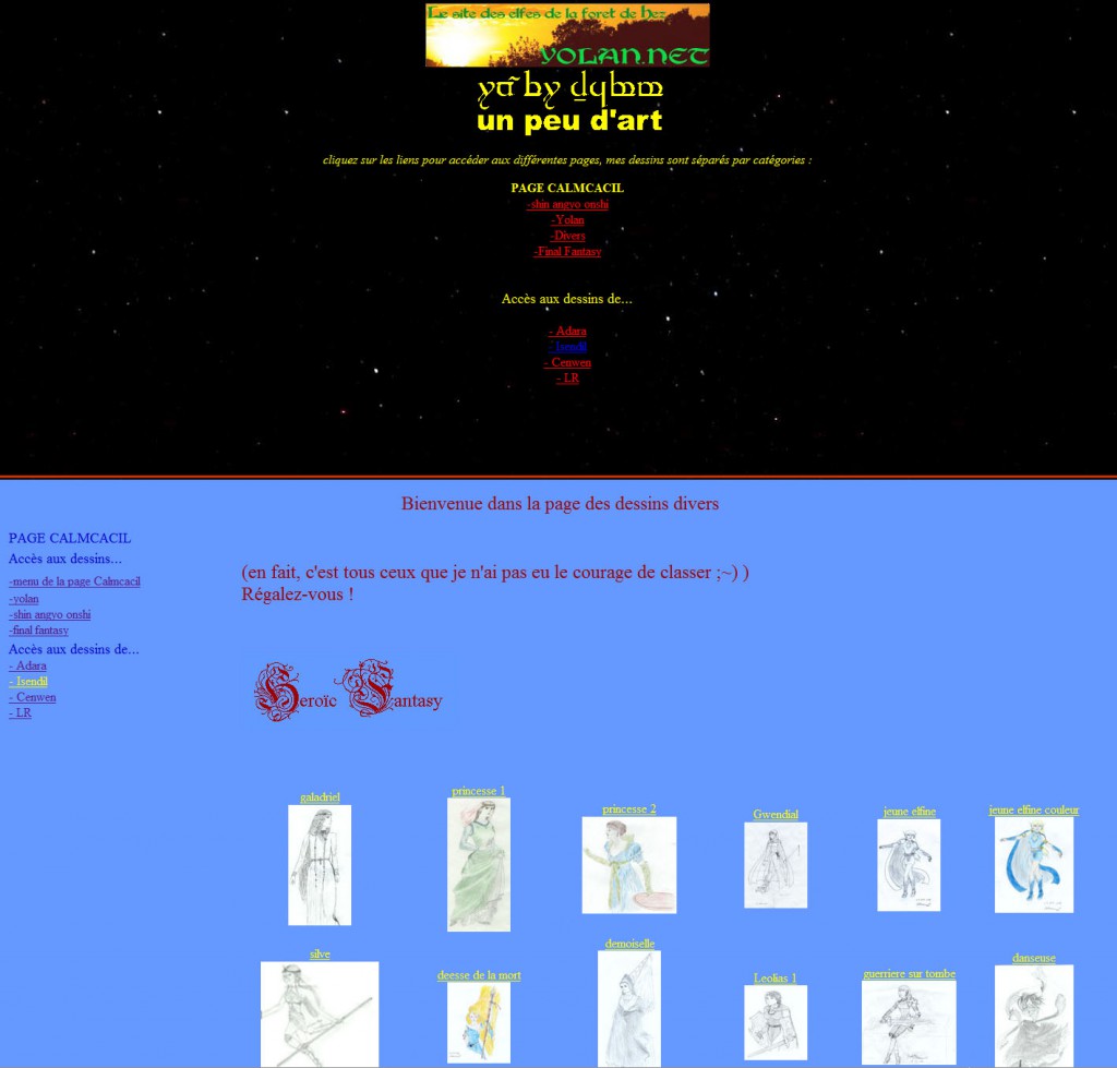 Les Pages Calmcacil, créées en Janvier 2005, n’étaient initialement que quelques pages du site internet Yolan.net (aujourd’hui disparu) m’ayant été allouées. Elles regroupaient mes quelques dessins de jeune ado, dans ce style graphique bien caractéristique de l’internet du début des années 2000 !
