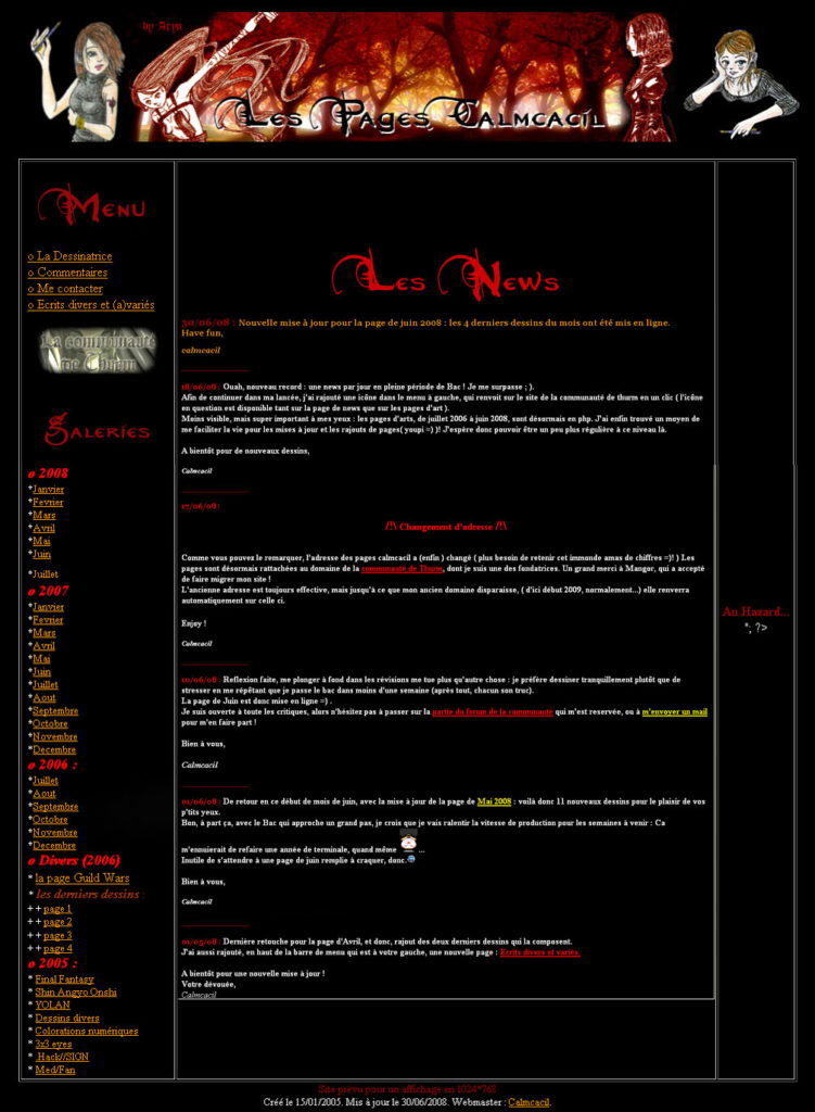 Les années passants (et le nombre de dessin augmentant drastiquement), les Pages Calmcacil ont évolué et je les ai migrées vers un site « dédié » : pages.calmcacil.free.fr. Ayant par ailleurs appris quelques bases de HTML et CSS, je décidais de relancer une nouvelle version de ce site, pour en rendre la navigation plus agréable (pour l’époque, hein !). A l’heure où j’écris ces lignes, je crois que ce vieux site existe toujours… !